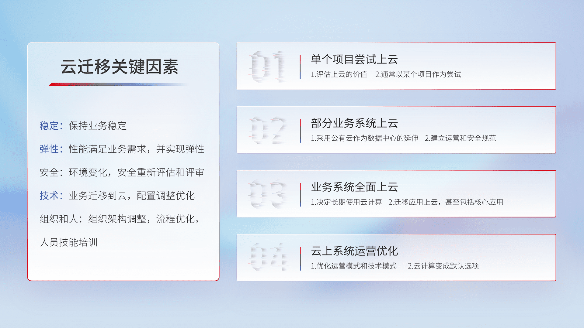 结合实际业务,,,,从规划设计、、、、云平台选型、、云原生改造、、数据迁移、、集成交付,,,,迁移全过程为客户识别最佳上云路径,,,做好风险识别管理,,,设计网络架构、、、身份权限、、安全审计合规、、操作审计、、、日志审计、、、监控告警策略、、、、多站点容灾设计等,,,,对云上基础设施进行整体规划,,,提升IT治理水平,,,以满足弹性、、、高可用、、高性能的需求。。。。