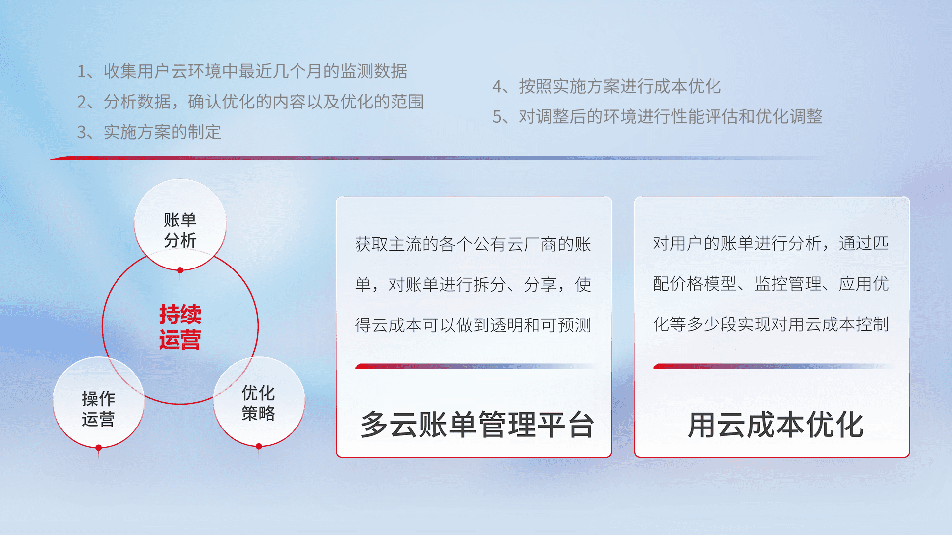 通过多云纳管,,,以统一的资源数据模型把客户的云资源进行抽象和封装,,,,进而实现对多云资源的统一操作,,,保障云资源管理的可靠性、、稳定性与可用性。。量身定制化运维内容,,,配置、、开发运维、、补丁管理、、备份、、、、监控、、、认证和访问管理、、审计和日常巡检等,,,,保障在用云过程中的可靠度,,,,稳定度以及高可用率。。